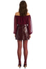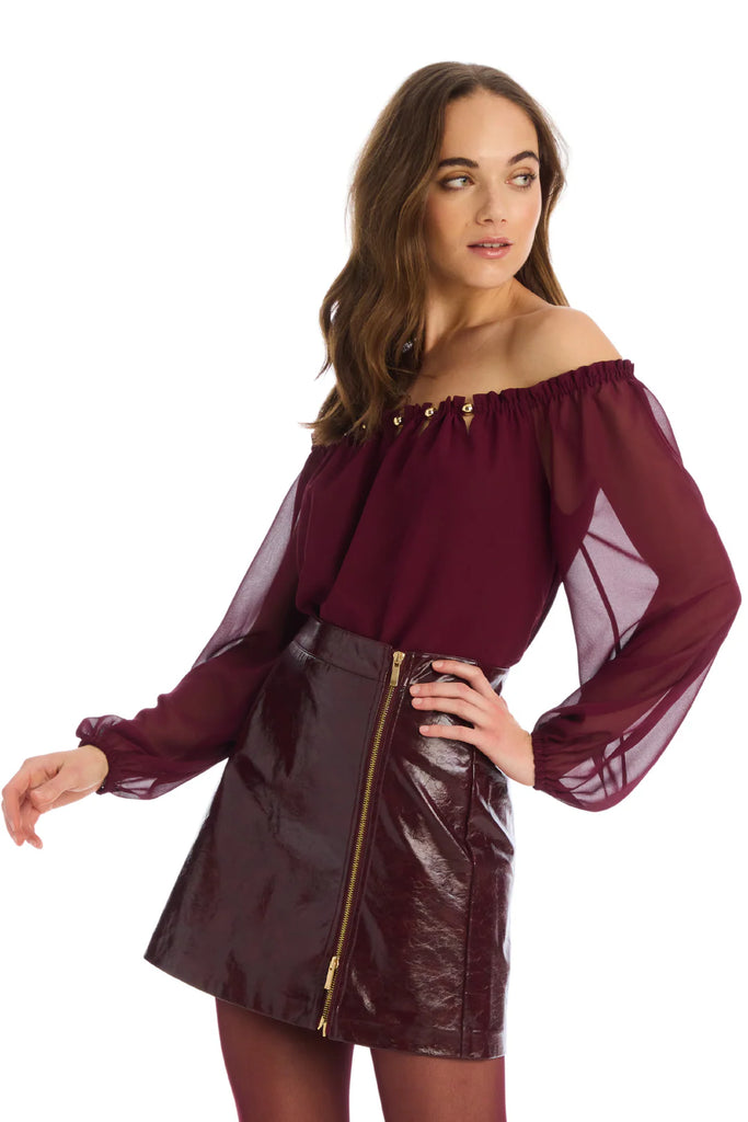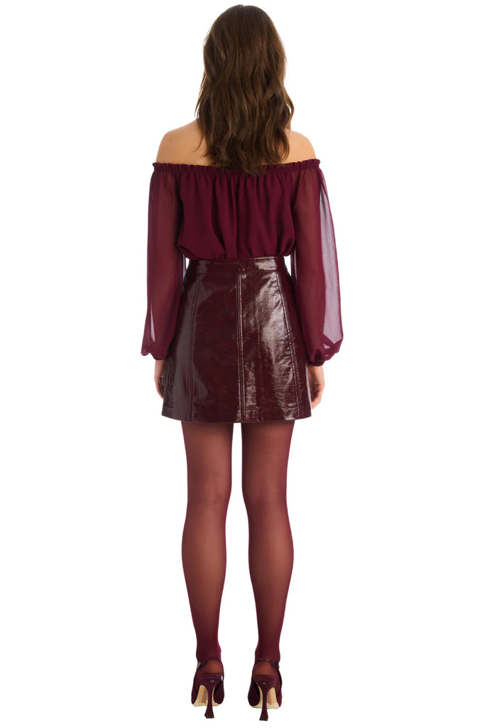 The River Skirt is an instant favorite, cut in a shiny faux leather fabrication and adorned with a chunky two-way gold zipper. Designed with a fixed waistband with no stretch and fitted through the hips with an A-Line shape. Fully lined. We love the River Skirt paired back to a chunky sweater or for a sleeker look, with the Rita knit top in oxblood.
