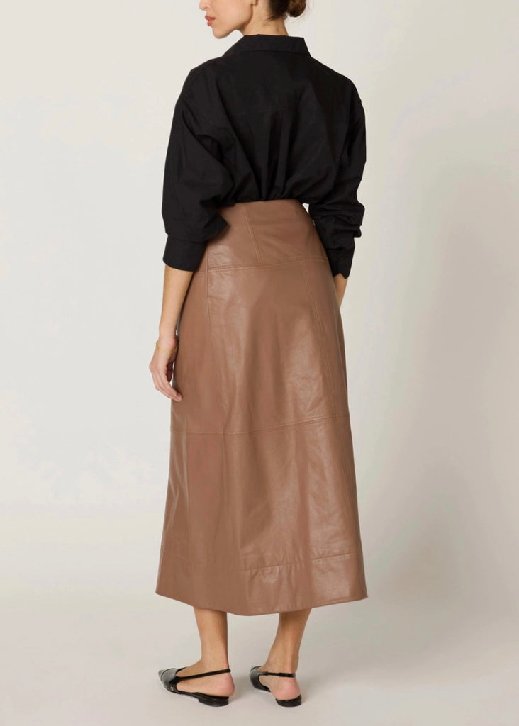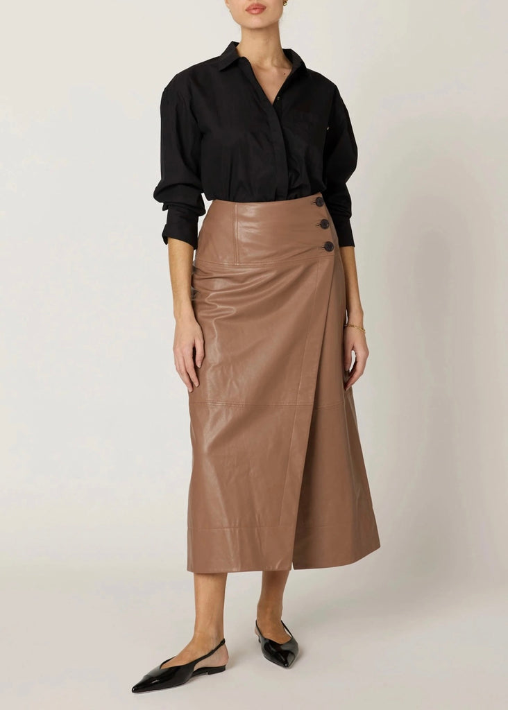 The Livia Ankle Skirt brings modern sophistication to your wardrobe. Ethically crafted in 100% sheep leather, this wrap-style midi skirt features a button closure and a sleek slanted front opening for a flattering silhouette. Designed for both versatility and elegance, the Livia Skirt transitions effortlessly from day to night, offering a polished look that transcends seasons.