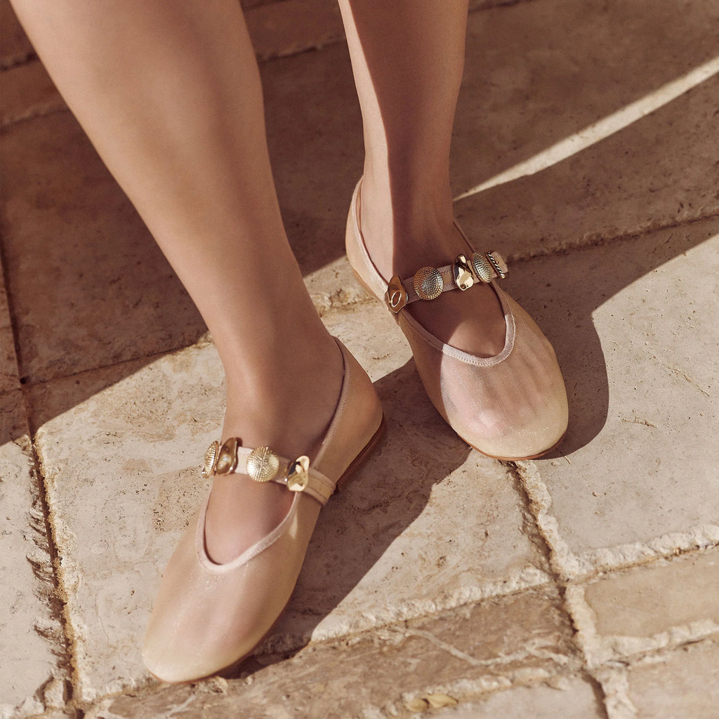 Relan's comfortable yet elevated design is soft and airy. This sustainably crafted ballet flat features a round toe and jewelry-like gold metal accents along her adjustable buckled strap. The creamy french vanilla in a barely-there mesh is the perfect chic neutral for warmer days. Whether you’re headed to weekend brunch with friends or into the office on a busy weekday, she’s an easy-to-style addition to your everyday wardrobe.