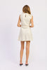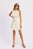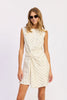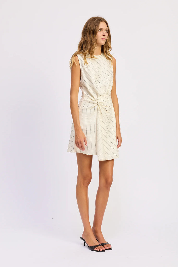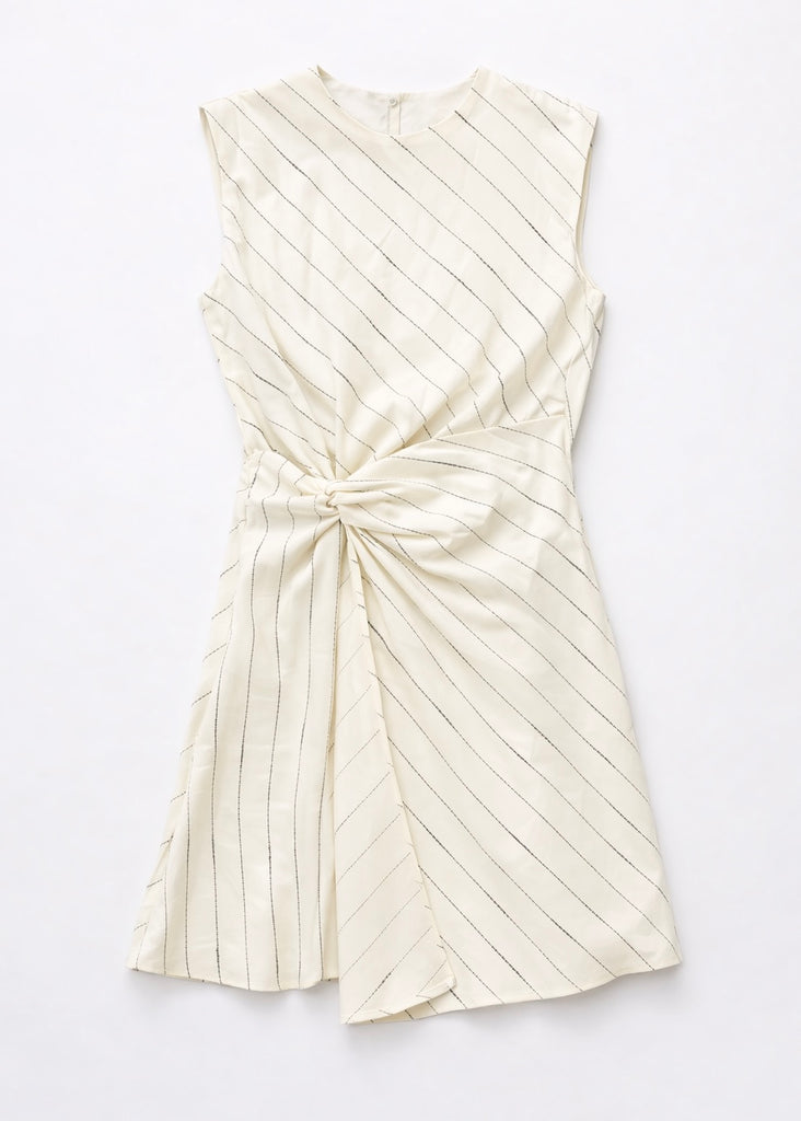 Effortlessly chic with a subtle statement, this ivory mini dress is all about modern polish. Designed with a sleeveless silhouette and soft diagonal pinstripes, it features an artful twist detail at the waist that creates a flattering, draped effect. The asymmetric overlay adds movement and interest while keeping the look refined and easy. Lightweight and versatile, this piece transitions seamlessly from daytime plans to evening dinners—just swap flats for heels and go.