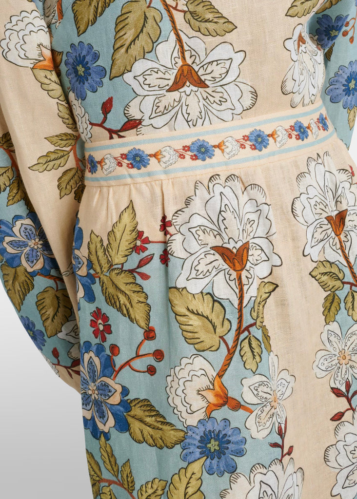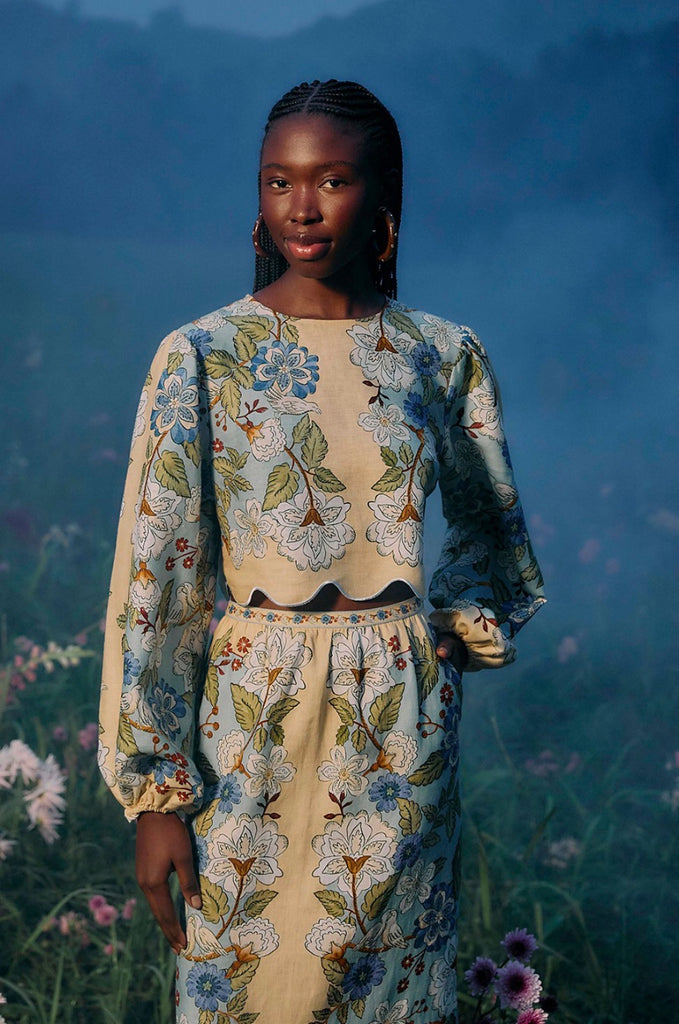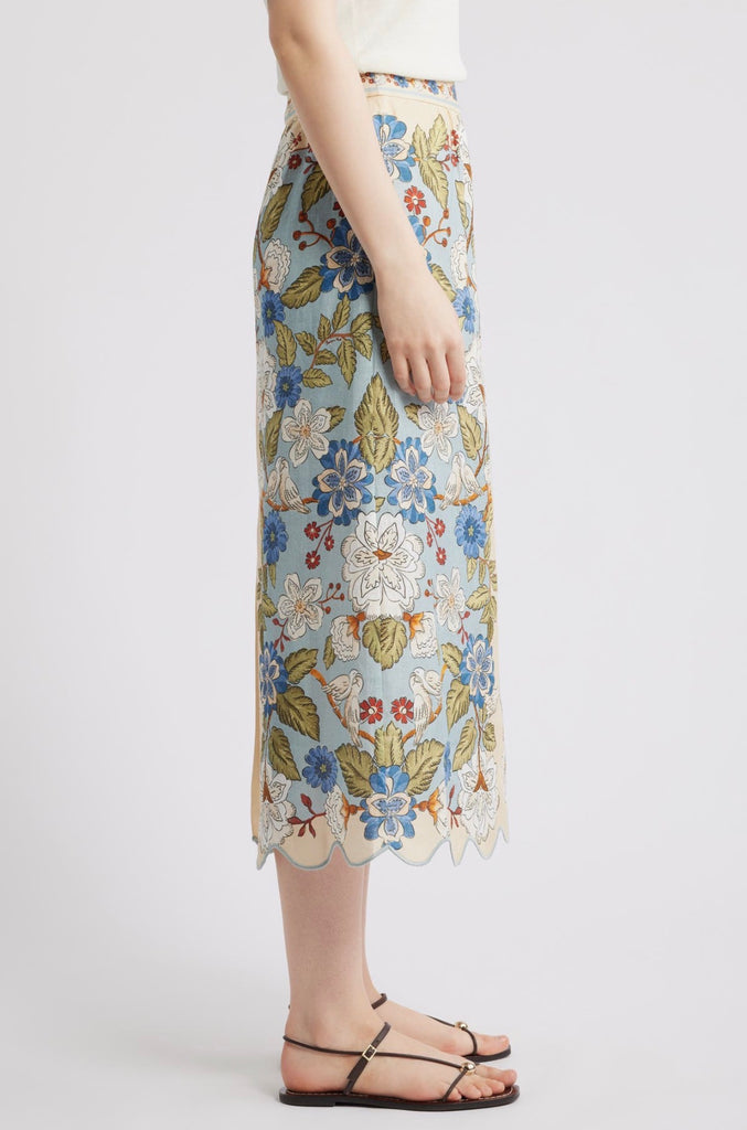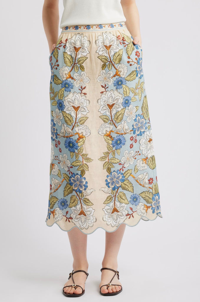 Flowers and doves bring pretty presence to a pure linen midi skirt finished with a dainty scalloped hem. Pair with the Garden Scarf Blouse for a sweet matching set.