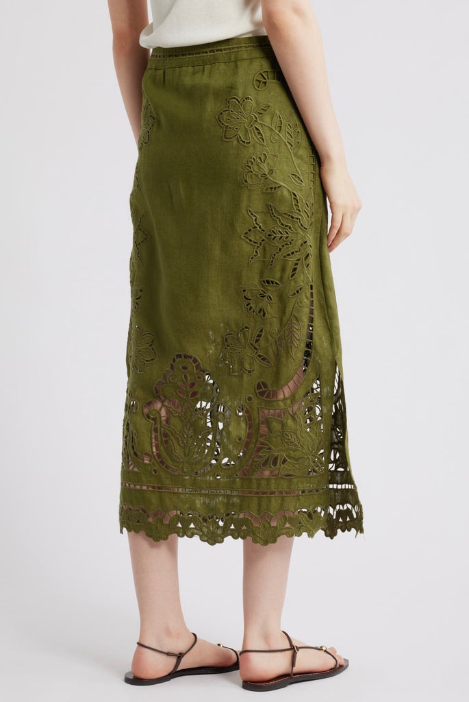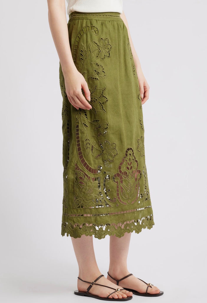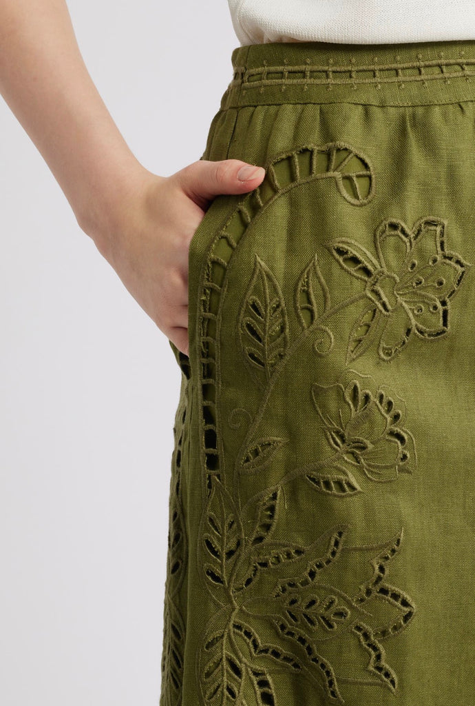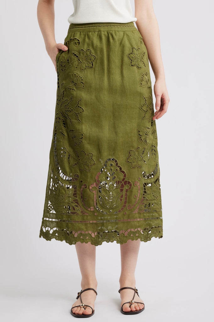 Airy embroidered eyelets let cool breezes flow through this midi skirt made from pure linen.