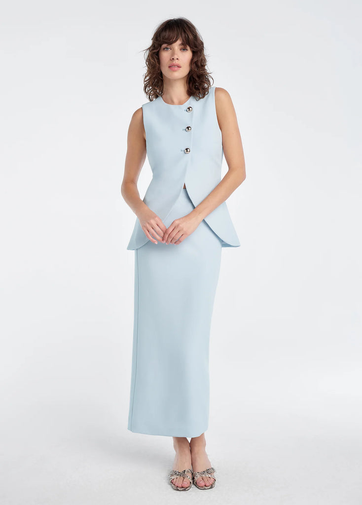 Tailored for spring. The Rachel Skirt is a slim-fit midi in lightweight suiting blend with a side zipper and back vent. Fully lined and hitting at or just above the ankle, it pairs perfectly with The Rachel Vest or Cecilia Tank, both in Sky Blue, for a timeless & chic, tonal set.