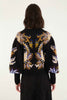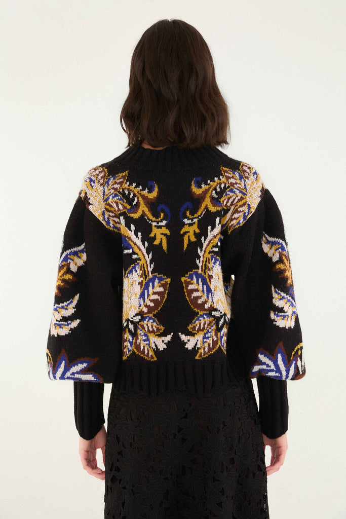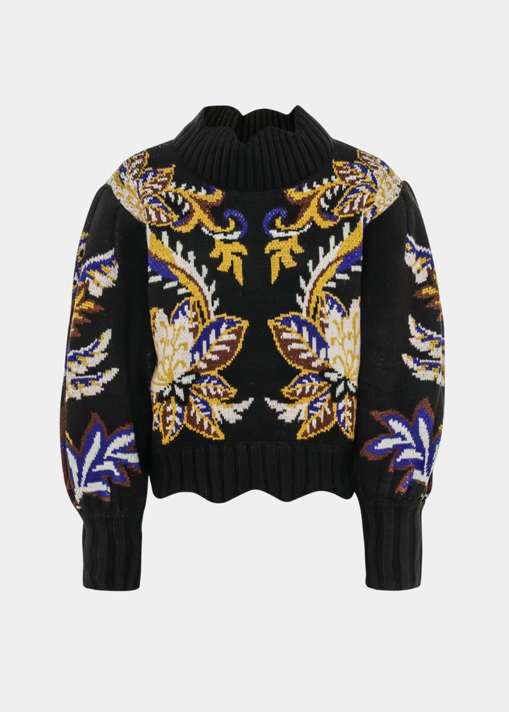 The Arabesque Paradise Knit Sweater enchants with its high neckline and voluminous sleeves, embracing a relaxed yet elegant silhouette. Crafted in deep black, it features a rich arabesque pattern in warm gold, royal blue, and creamy white hues, evoking a sense of adventurous spirit and cozy sophistication. This knitwear piece invites playful charm and timeless style, perfect for layering moments filled with warmth and artistry.