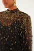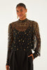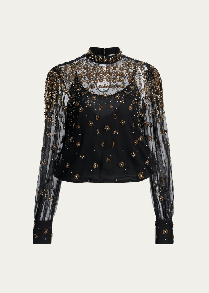 Radiate elegance with this beaded & embroidered blouse. The sheer black tulle fabrication lends a delicate transparency to the long sleeves and neckline, adorned with intricate golden floral embroidery and pearl accents that shimmer playfully. The high collar and softly gathered sleeves create a graceful silhouette, while the inner lining offers subtle coverage. Perfect for moments when you want to feel both bold and tenderly feminine.
