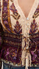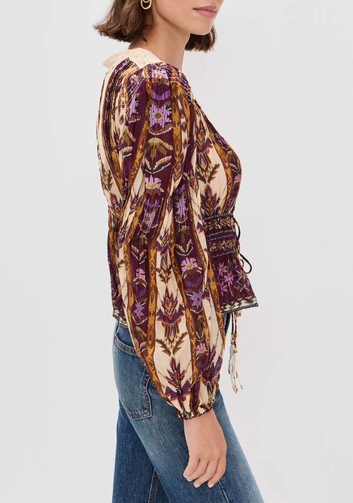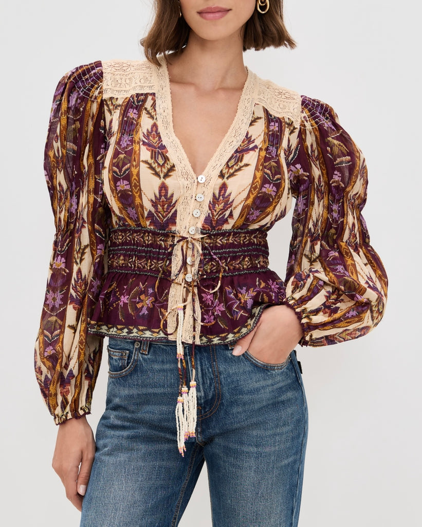 This enchanting top features a playful V neckline adorned with delicate lace trims, while the rich tapestry-inspired embroidery bursts in calming purples and earthy tones. Voluminous sleeves gather softly at the cuffs, and a cinched waist with intricate smocking and tassel ties sculpts a flattering silhouette.