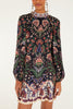 The Marvelous Garden mini dress features a high neckline and softly gathered balloon sleeves that frame a vibrant botanical print bursting with rich hues of green, pink, and blue. The flared silhouette ends in delicate pleats, adding graceful movement and a playful touch, while subtle gold ring details elevate its feminine charm with a warm, artful spirit.
