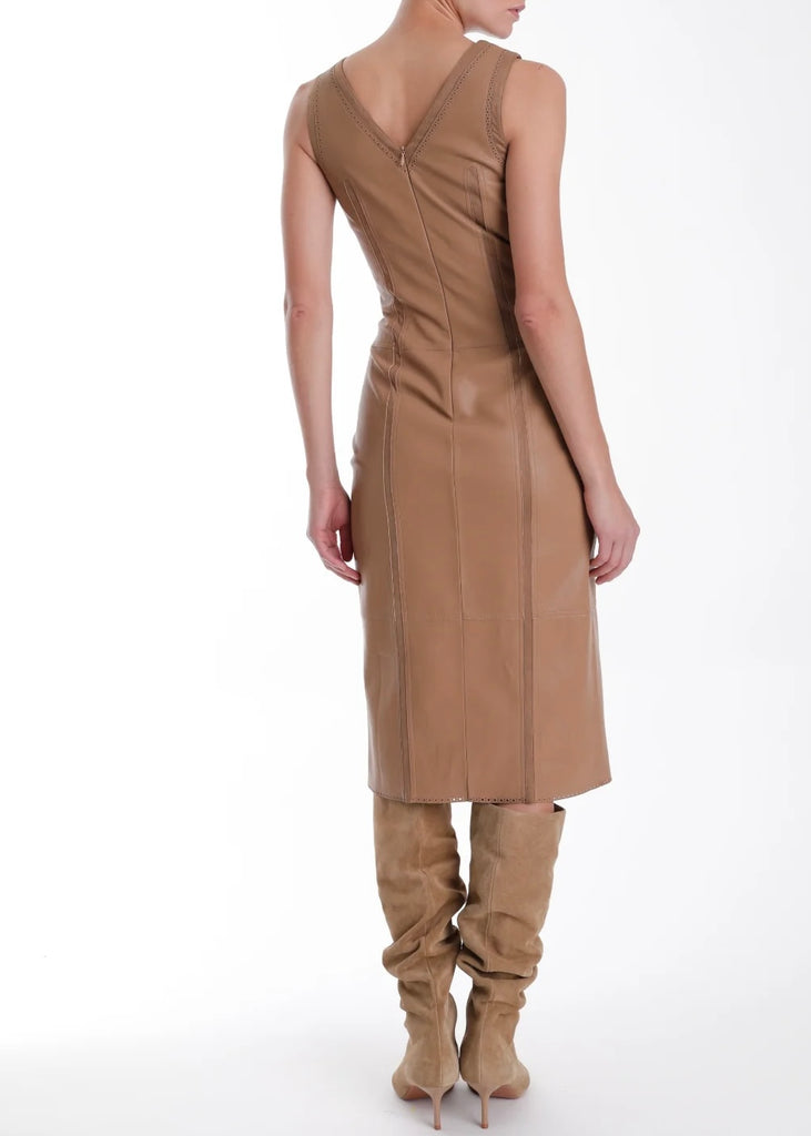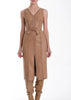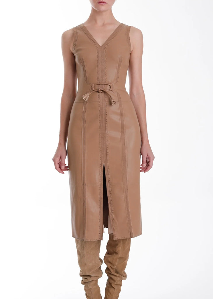 The Mona Vegan Leather Midi Dress combines edgy style with sustainable fashion. Featuring a sleek sleeveless design and a flattering V-neck, this dress is both bold and elegant. The front slit and tie waist detail add a touch of sophistication and movement, while the back zipper ensures a comfortable, tailored fit. Made from high-quality vegan leather, it’s the perfect choice for making a confident, chic statement at any event. Pair with suede boots, slingbacks or strappy heels.