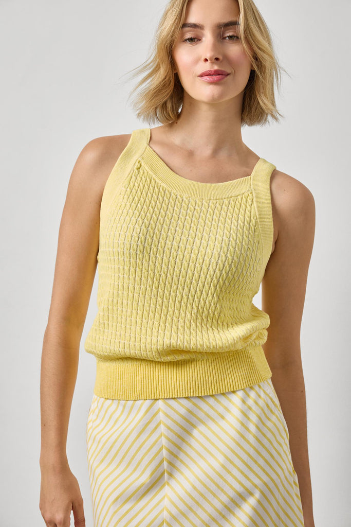 Sun-washed and endlessly wearable, this textured knit tank brings an effortless polish to everyday dressing. Designed with a softly structured silhouette, it features a dimensional cable knit throughout, wide straps, and a flattering ribbed waistband that cinches just right. The subtle texture adds interest while keeping the look clean, making it an easy pairing for everything from tailored shorts to breezy skirts.