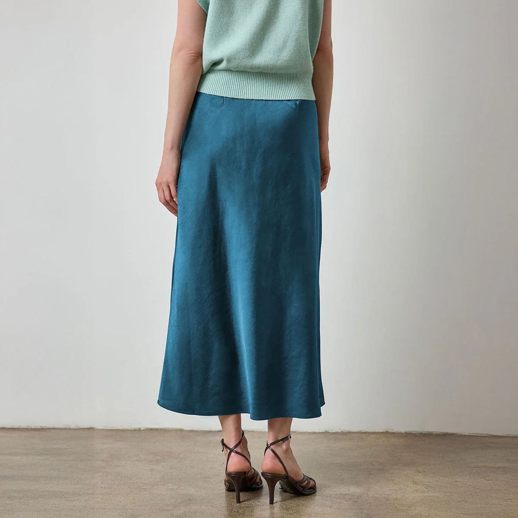 The Satin Slit Front Skirt in satin twill has just the right weight, giving it a fluid drape that feels substantial without being too heavy. Designed with a simple hidden elastic waistband for a smooth, comfortable fit, this bias-cut maxi skirt moves effortlessly with the body. An asymmetrical seam and off-center slit add extra detail to this classic shape. Pair it with one of the coordinating Short Sleeve Sparkle Sweater in Deep Sea or either of the Shor Sleeve Brushed Crewnecks.
