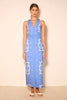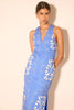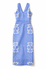 A refined statement piece designed to stand on its own. This sleeveless ankle dress features a clean V-neckline and a tailored silhouette, brought to life with intricate contrast embroidery throughout. The subtle waist detailing creates a flattering shape, while the structured fabric gives the dress a polished, architectural feel. Equal parts modern and timeless, it’s the kind of piece that looks considered without feeling overdone.