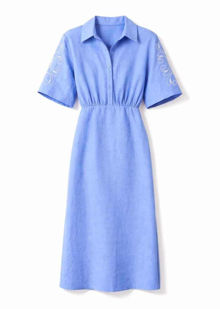 An easy elegance you’ll wear on repeat. This linen-blend midi dress features a softly structured silhouette with a relaxed collared neckline and short sleeves finished with delicate contrast embroidery. The gently cinched waist creates a flattering shape without feeling restrictive, while the breathable linen blend keeps it light and comfortable all day long. Finished with a clean midi hem, it’s equal parts polished and effortless.