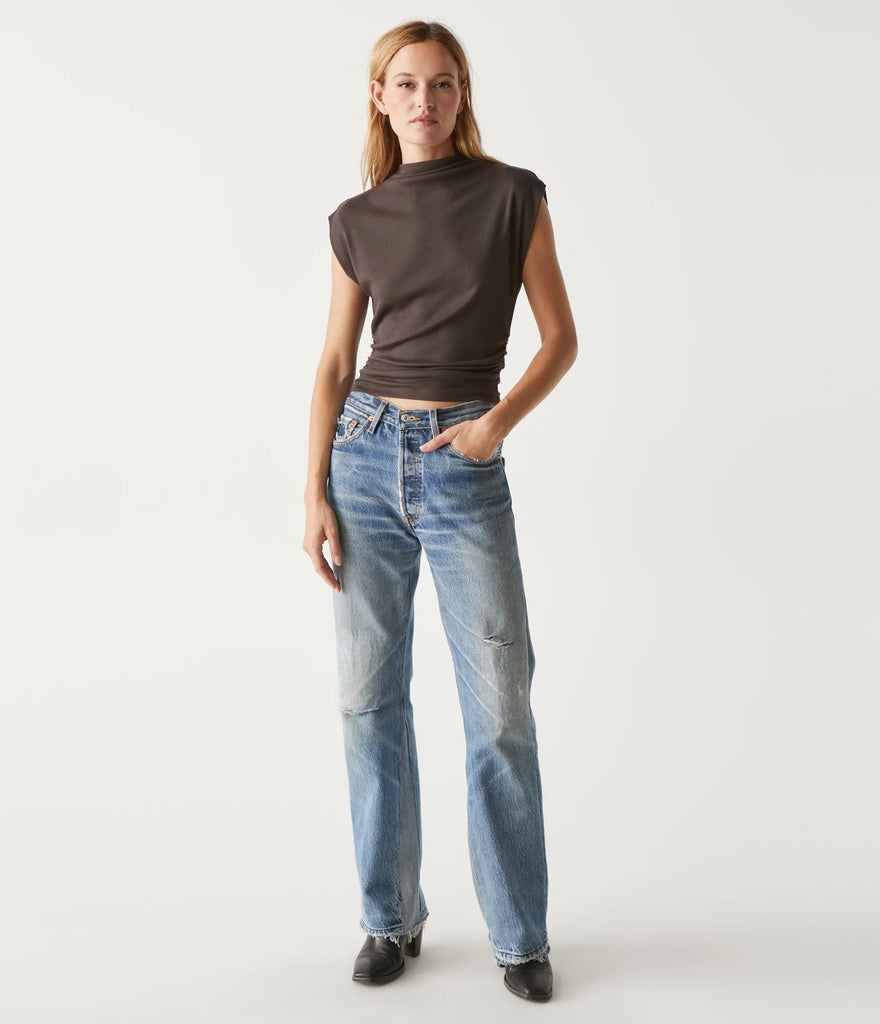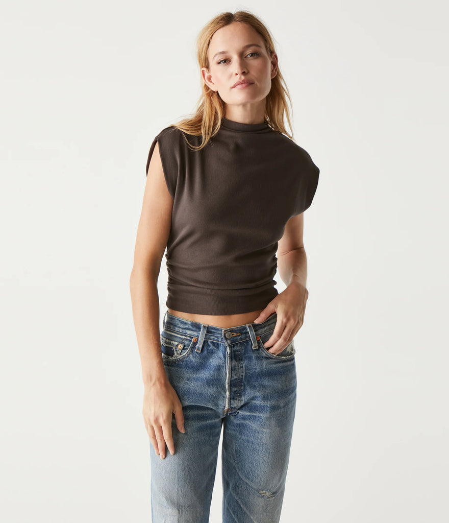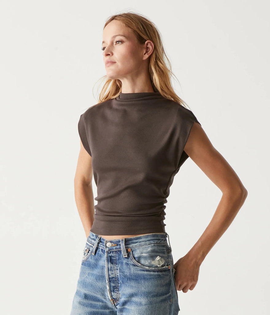 The day-to-night top. Amara has a power shoulder with a cropped silhouette, mock neck, and side ruching at the waist. Made from Michael Stars' soft Ultra Rib fabric that washes well and keeps its shape throughout wearing.