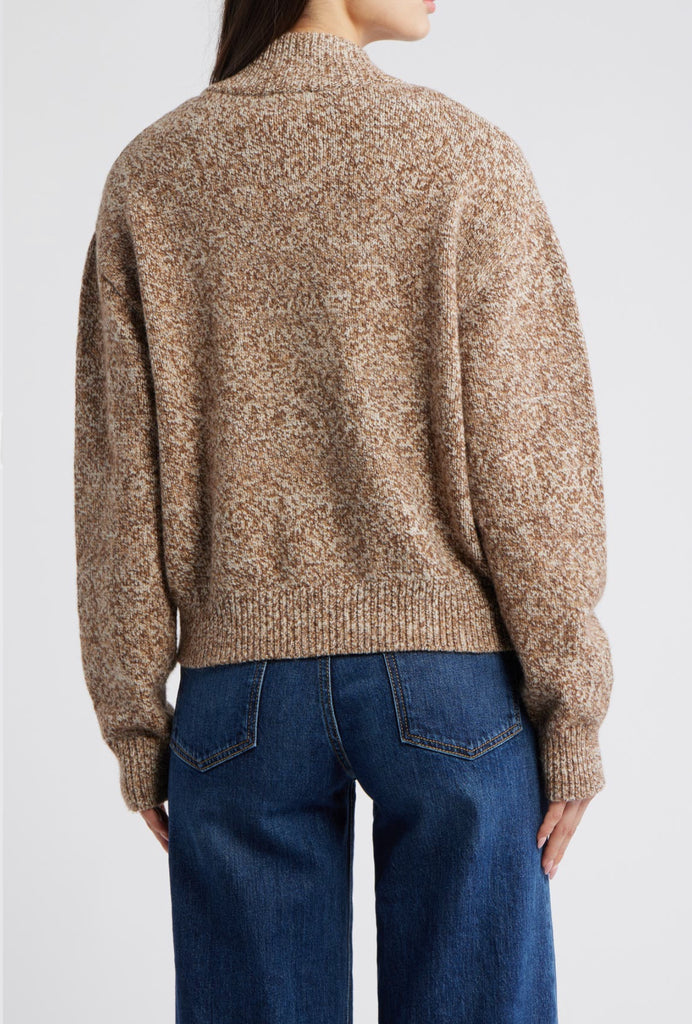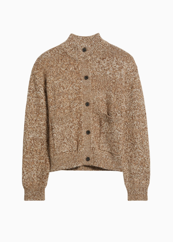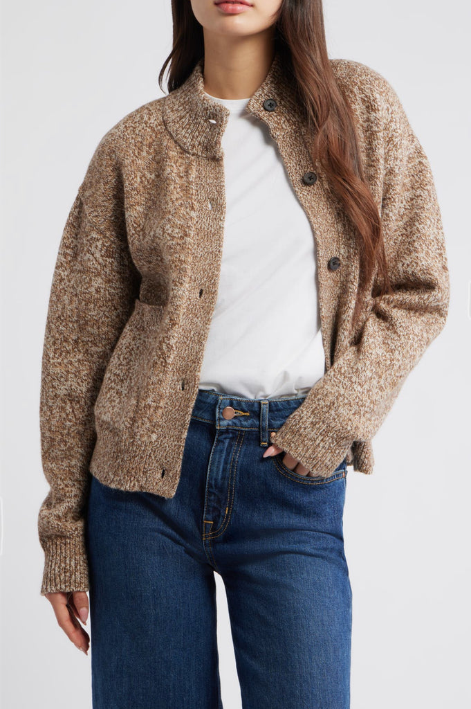 The Olvera is made from a buttery-soft marl knit with a stand collar, front button closures, and patch pockets. Long sleeves and ribbed trim complete this effortlessly polished sweater.