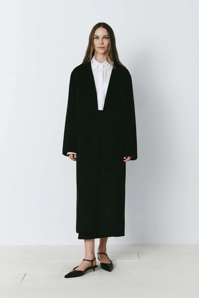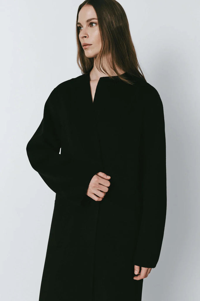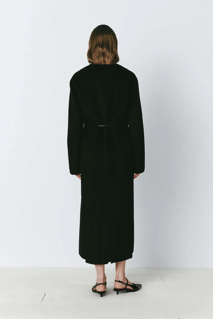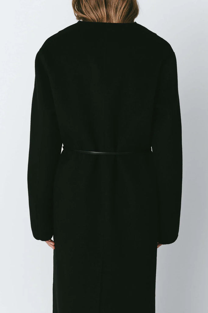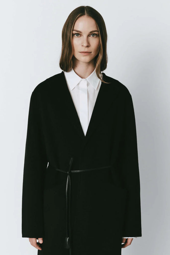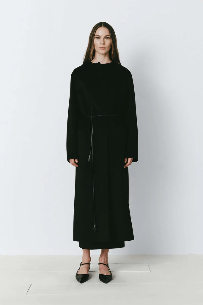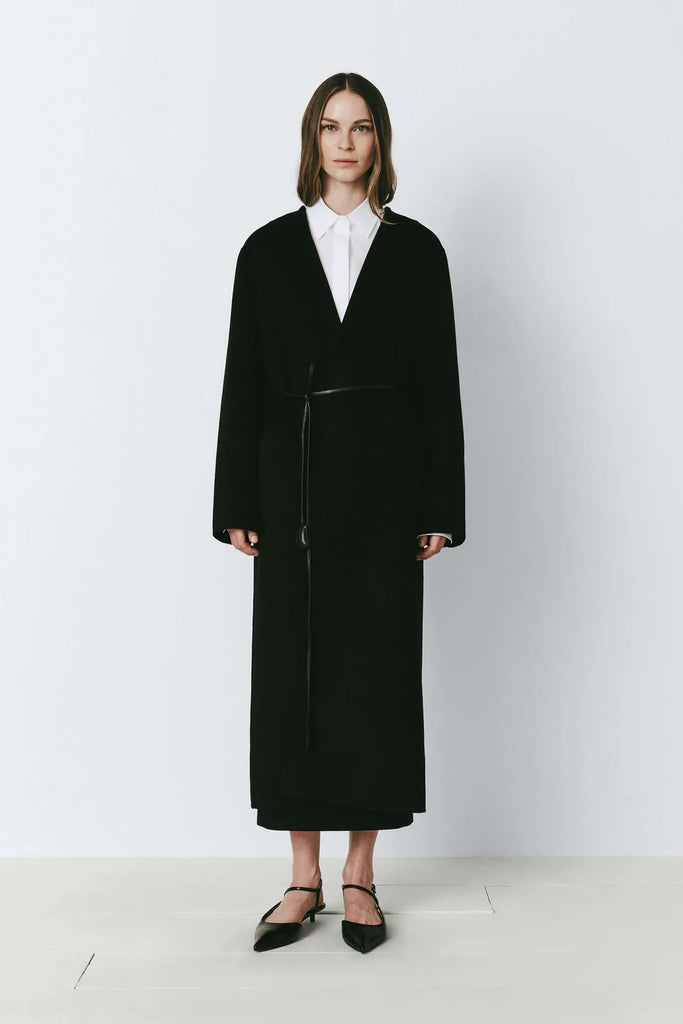 Heavyweight wool, cashmere and silk make up this elegant coat with an oversized silhouette and faux leather wrap tie belt. The double-faced fabric elevates this piece, perfect for cold weather layering with elegance.
