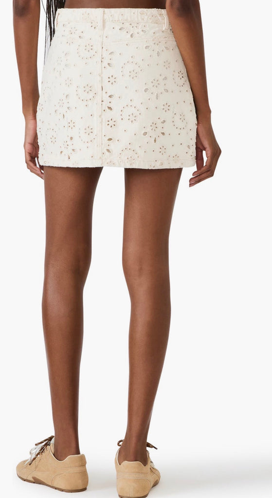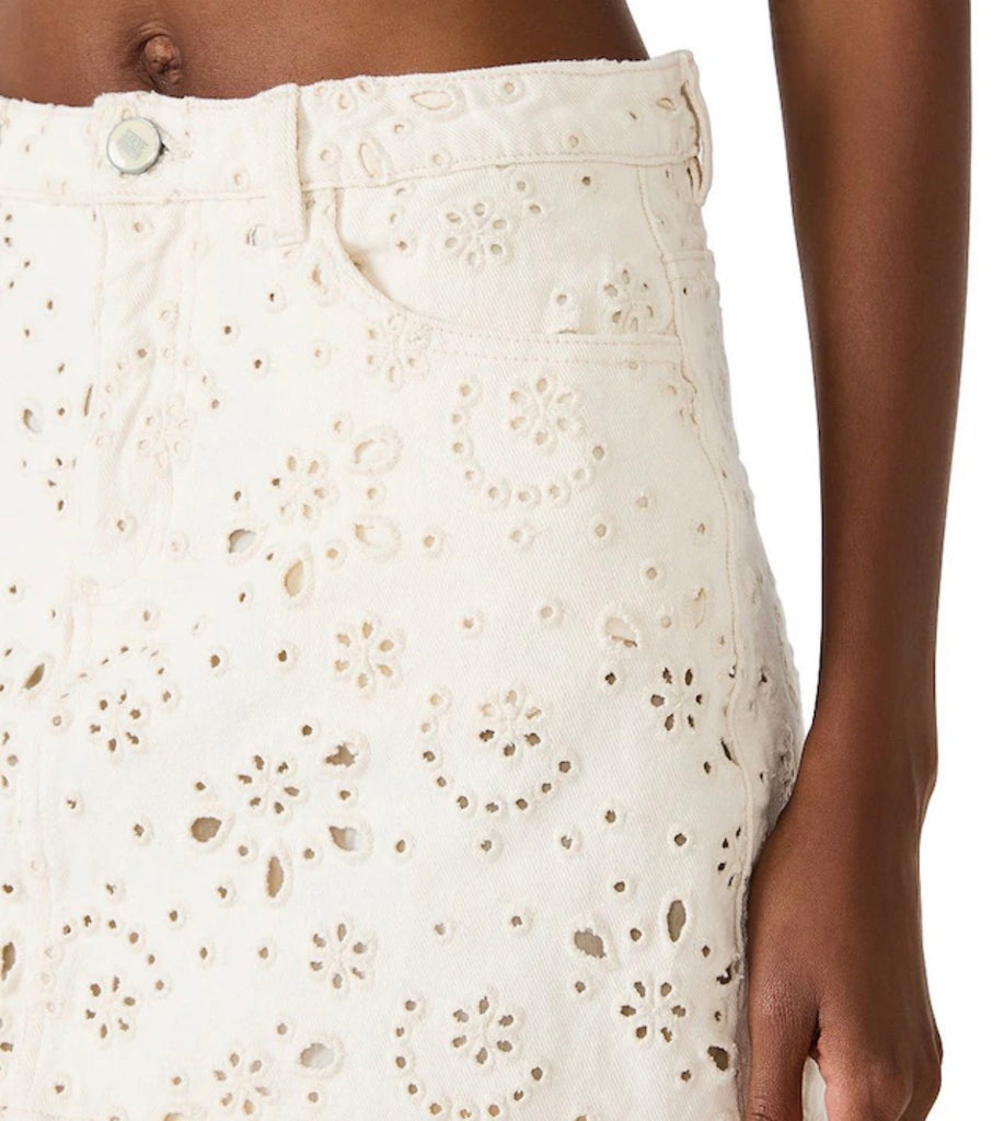 Airy eyelet embroidery is sprinkled across this denim miniskirt constructed with front scoop pockets and a classic slanted back yoke.