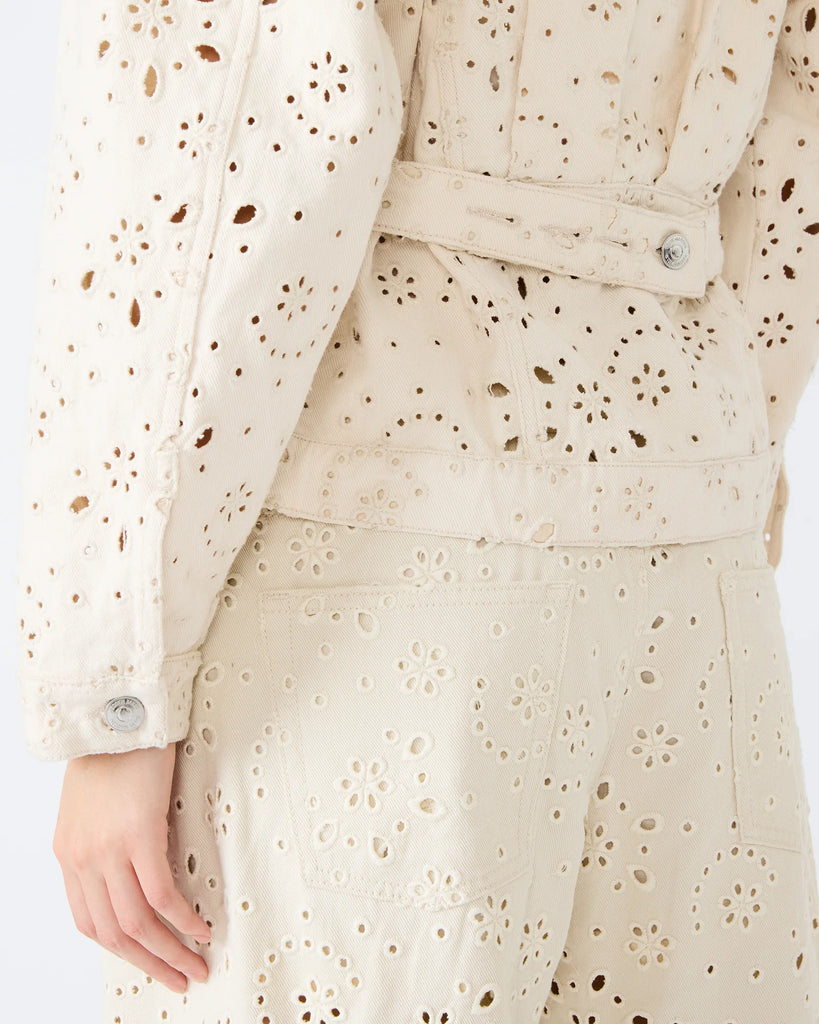 Embroidered eyelets bring sunny-day charm to this softly structured cotton-twill jacket framed by an adjustable martingale belt and utility pockets.