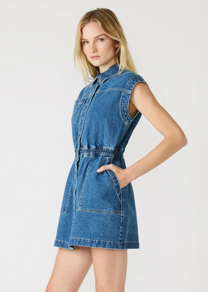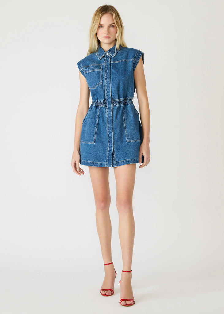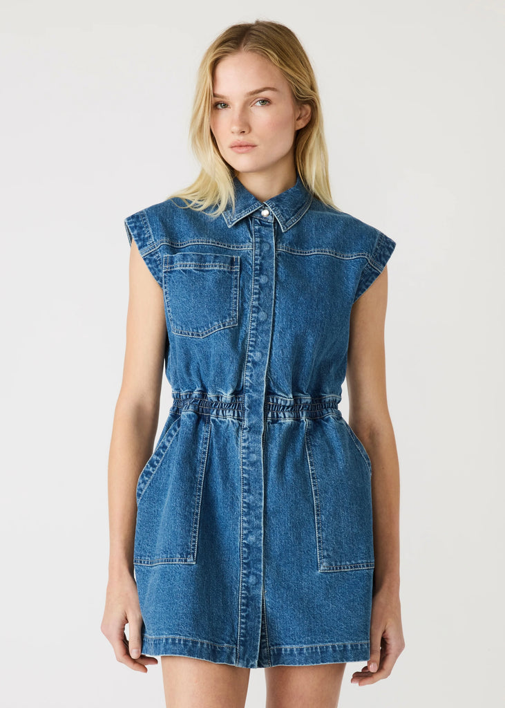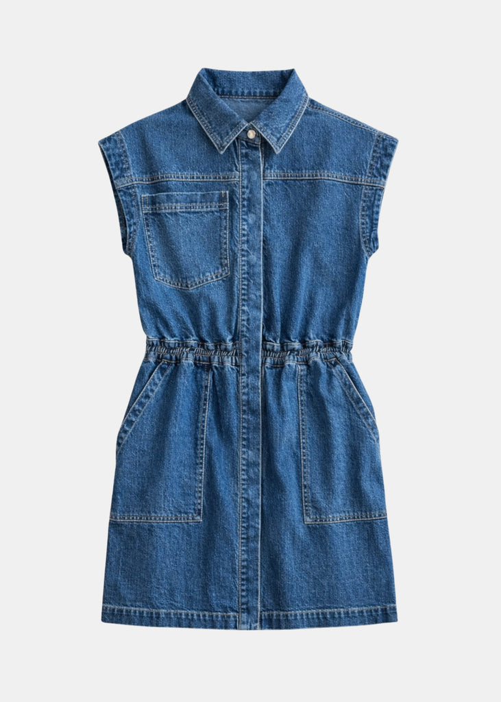 The Robbie denim dress combines timeless denim construction with modern versatility. This sleeveless style features a snap-front and crisp collared neckline for polished appeal. Functional front pockets add practical everyday utility. The structured denim fabric ensures lasting wear, while the streamlined silhouette transitions effortlessly from casual outings to elevated occasions. A wardrobe essential that delivers both style and substance.