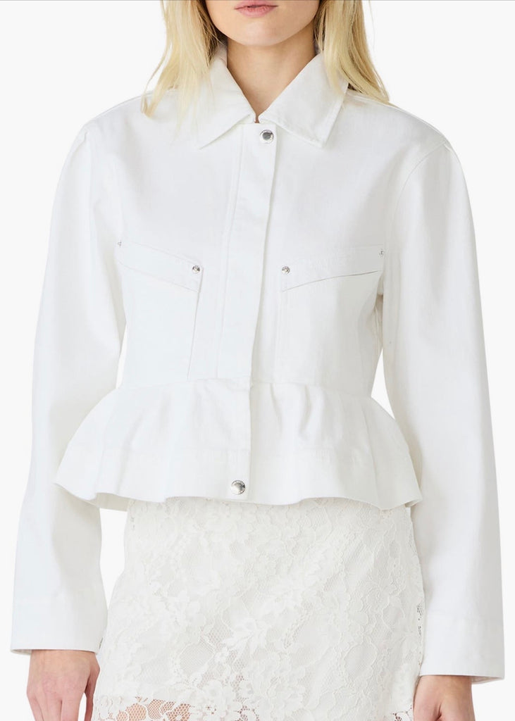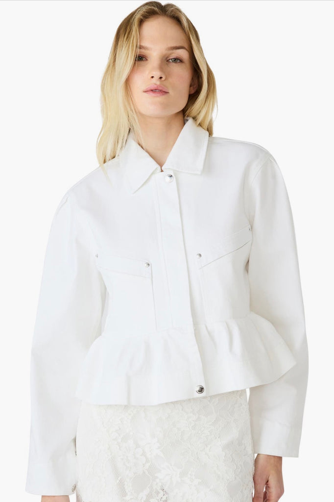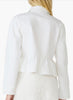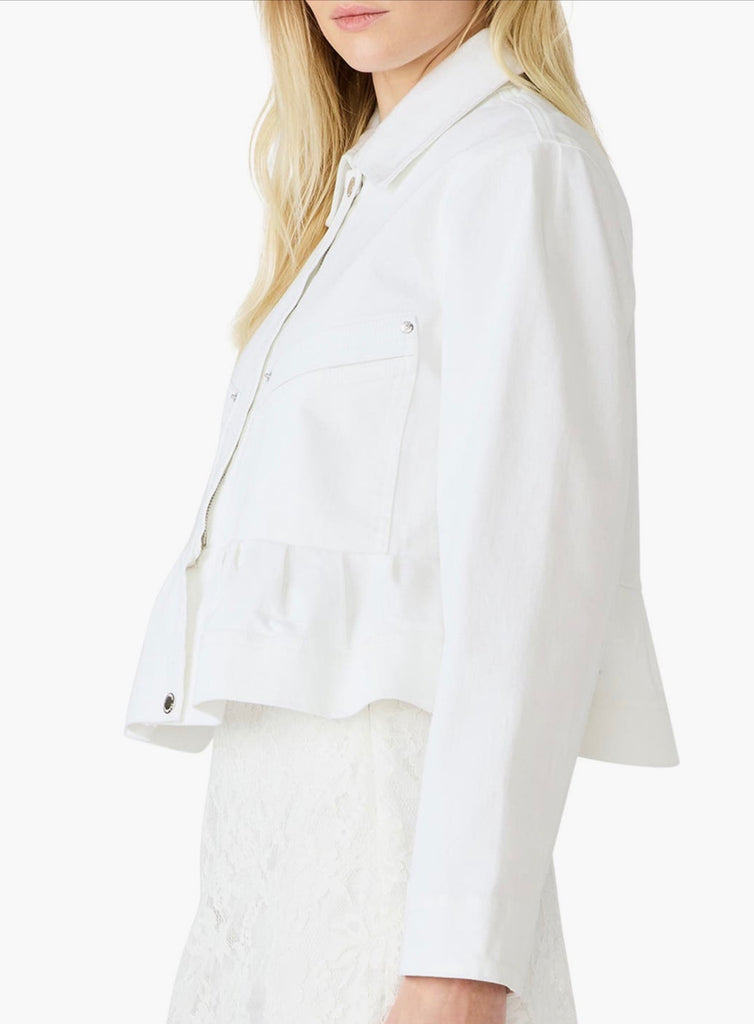 The utility/chore jacket gets feminine & flirty in this fitted, white denim version featuring a zippered front & peplum hem. Designed to have a close-to-the-body fit, this jacket can be worn layered over basics or on its own as a standout shirt.