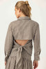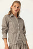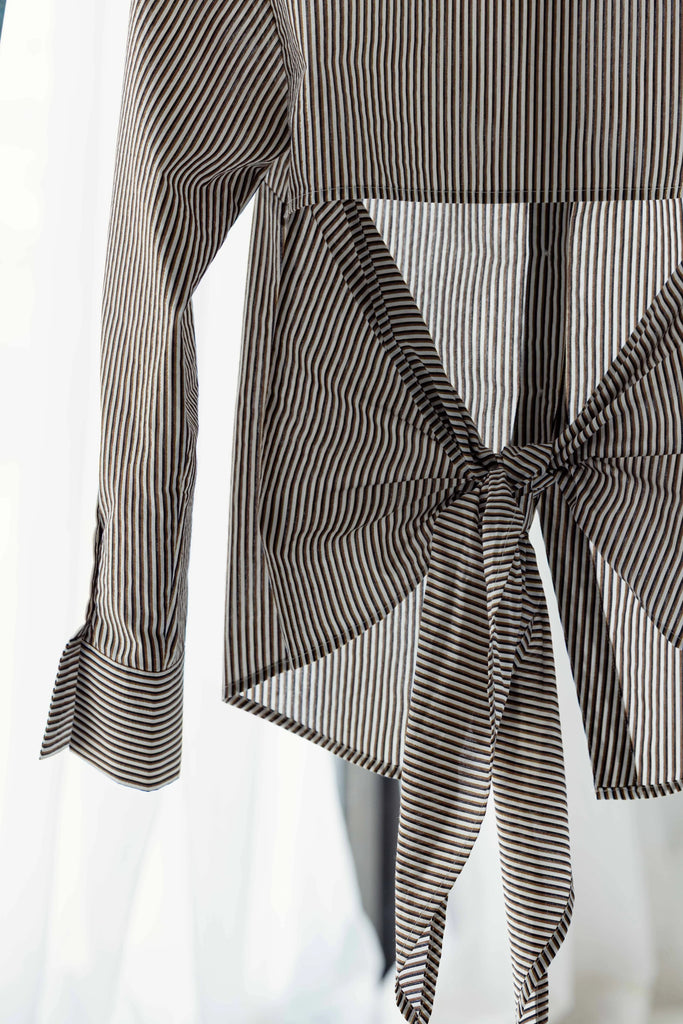 Made in the seasons' standout lurex stripe accented with subtle gold lurex detail, the Aster is an update on the classic button down - featuring an open back with an adjustable tie detail. It's a modern, versatile silhouette that styles effortlessly from day to night. Shown styled with the Striped Celeste Skirt or pair with your favorite vintage denim.