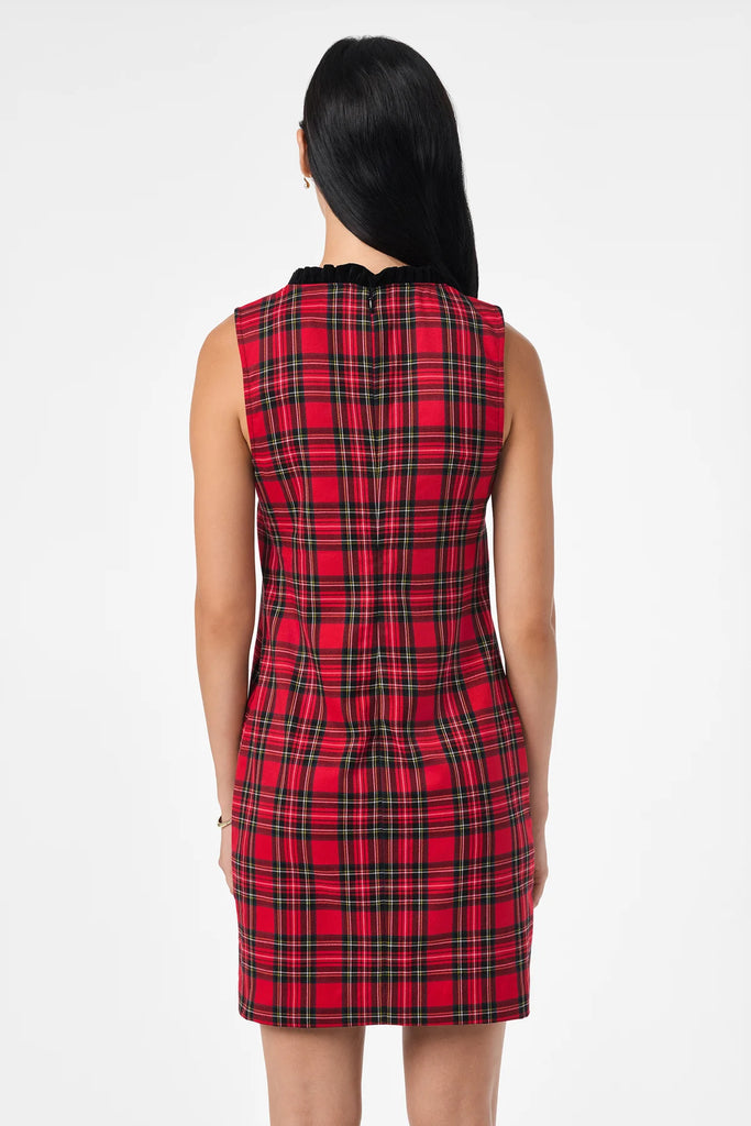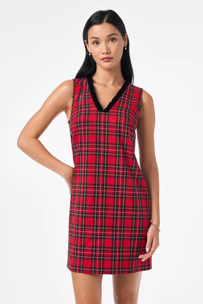 Perfect for holiday dressing and pretty-preppy styling, this red plaid dress will become a favorite statement piece. Made of yarn-dyed stretch woven plaid, this mini dress features a V-neck, velveteen trim at the neckline, and a center back invisible zip and hook and eye closure.