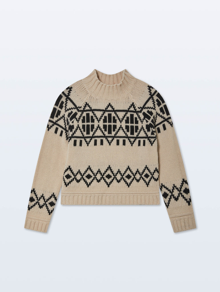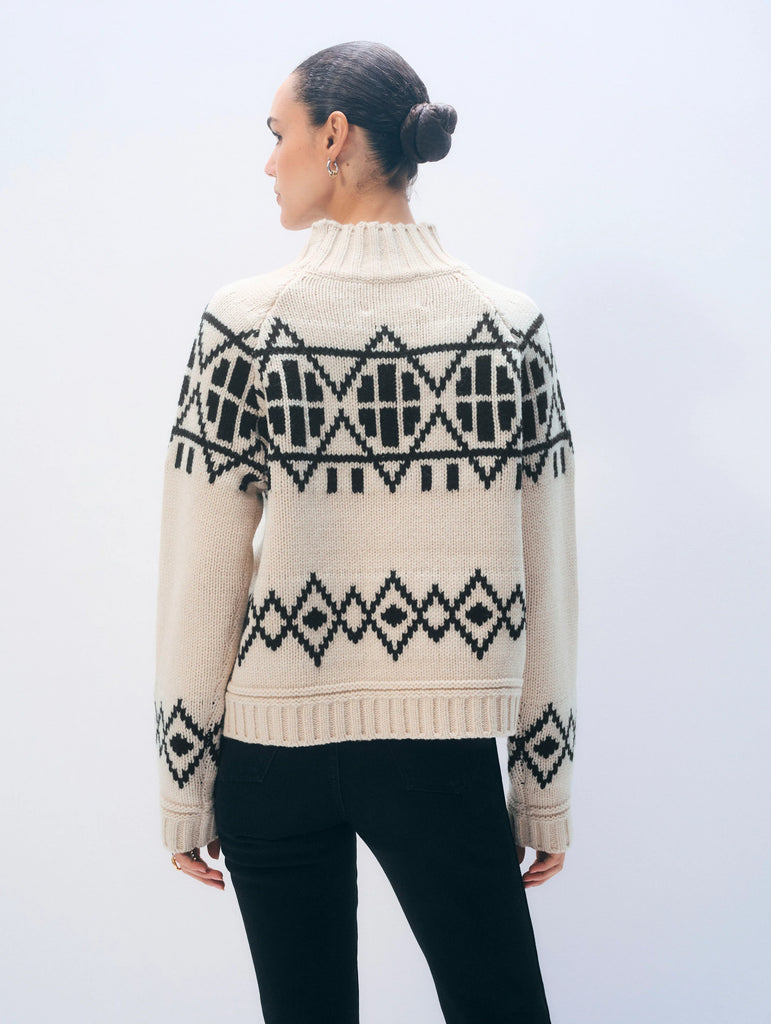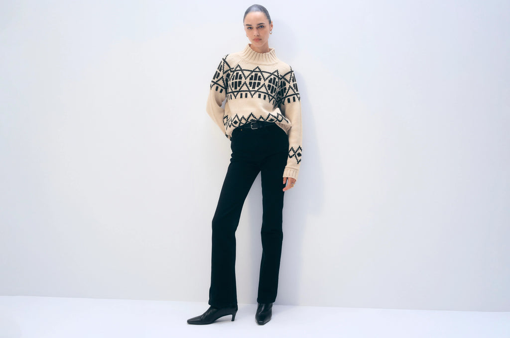 Heritage meets modern craftsmanship. Spun from merino wool in a classic Fair Isle pattern, this standneck sweater holds its shape beautifully while offering soft warmth. Size up for an oversized fit.
